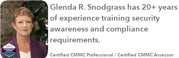 We are pleased to say that our President, Glenda R. Snodgrass, was among the first individuals to become a Certified CMMC Professional (CCP) in November 2022, and in May 2023, she became one of the first to pass the Certified CMMC Assessor exam. She is now a fully qualified Lead CCA and expects to participate on CMMC assessment teams in 2026 -- for the experience, to better prepare our clients for their own official assessments.